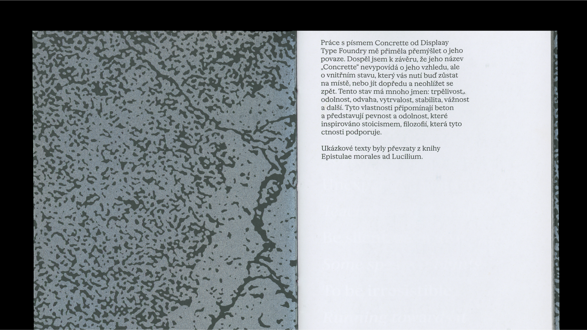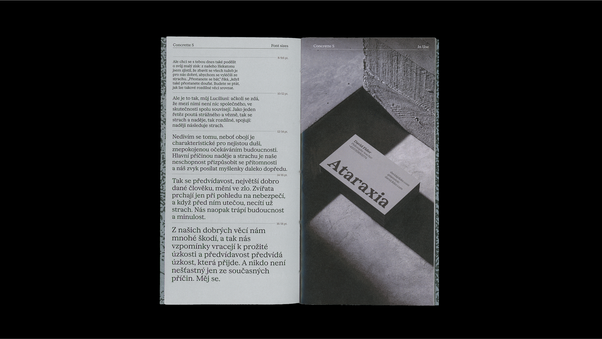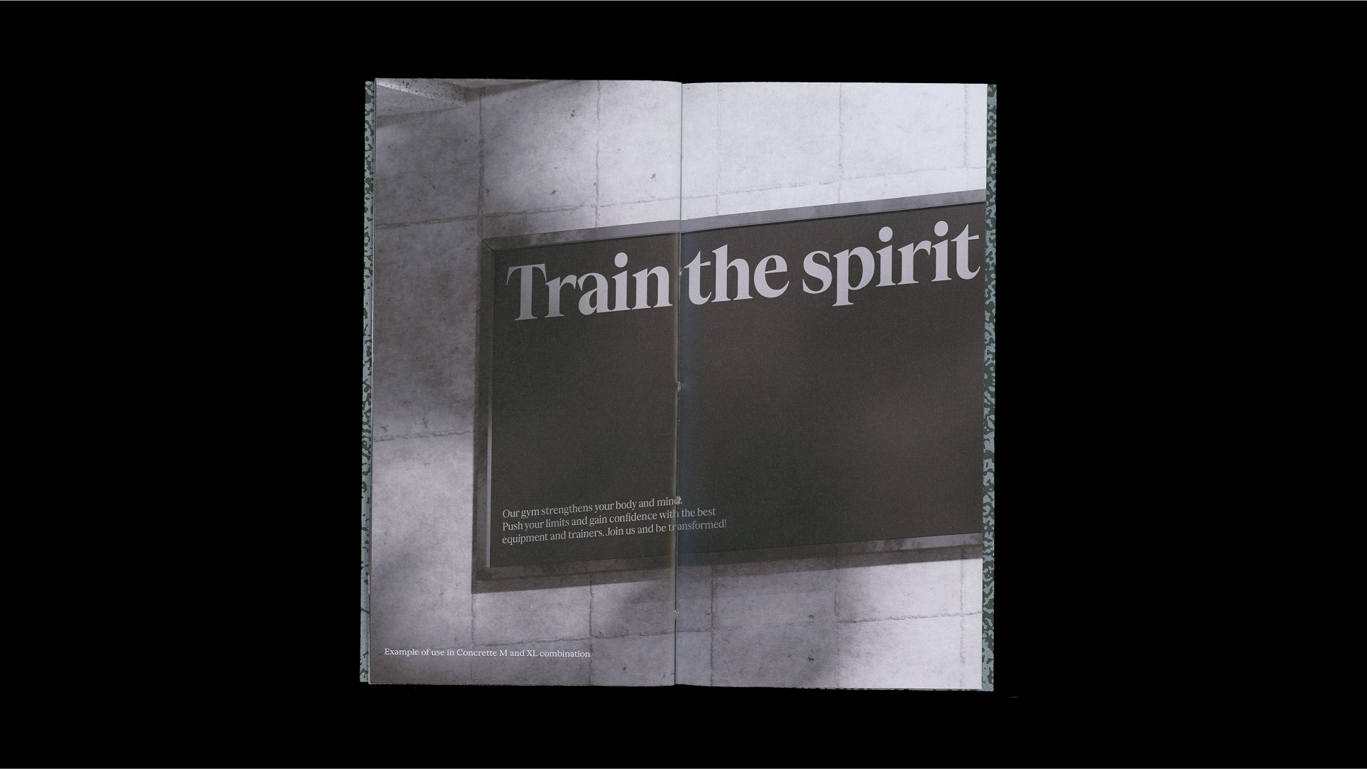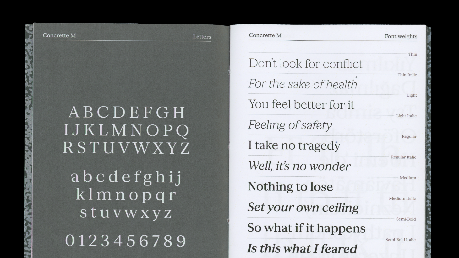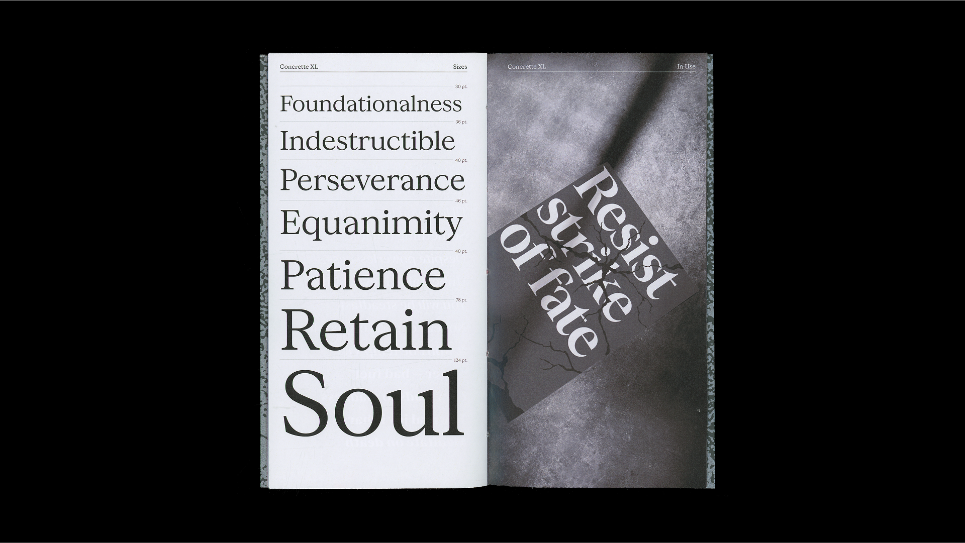 This is a type specimen for Concrette by Displaay Type Foundry. The name doesn’t show how it looks — but how it feels. It’s about patience, strength, and quiet seriousness.